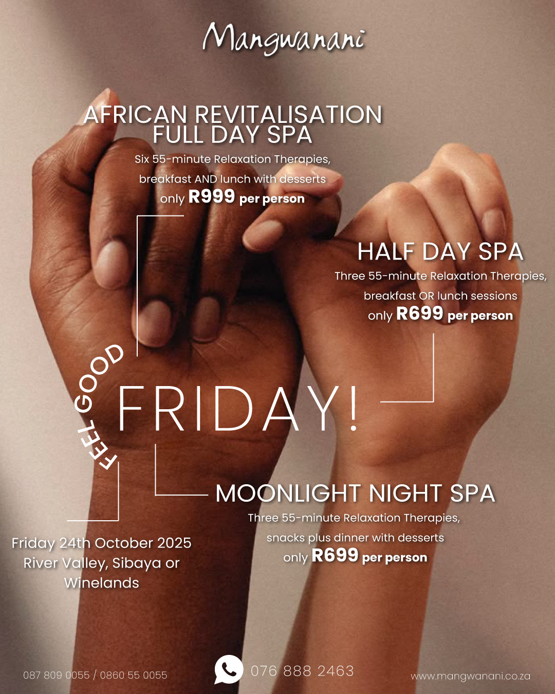 End your week on a high note with a day (or night) of pure relaxation at Mangwanani.