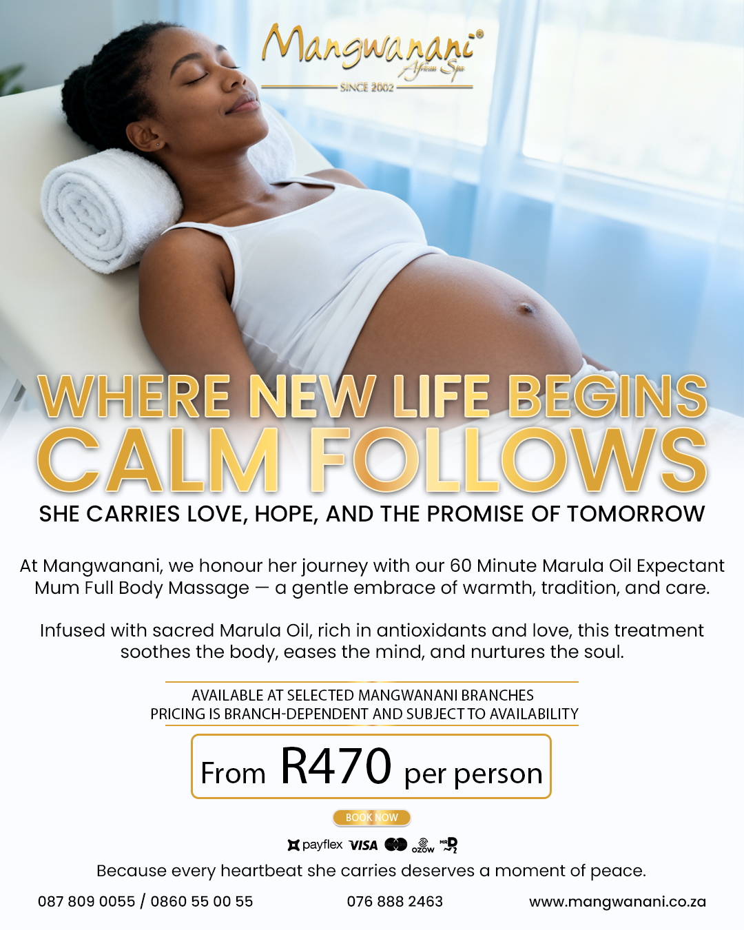 An indulgent treat for the Mum-To-Be using our signature Marula Oil Blend which is considered sacred. This Essential Oil is primarily extracted from the Marula fruit kernels which are rich in antioxidants and Amino Acids. The Marula tree is linked to Fertility and Happiness. According to Venda Culture the bark infusions from the Marula tree can be used to determine if your baby is a boy or a girl. The amount of Vitamin C found in a single Marula fruit is eight times that of an Orange. Pregnancy is accompanied by constant hormonal and body changes and Marula Oil assists in strengthening the skins elasticity for lesser occurrence of skin damage from your growing bundle of joy. Enjoy the feeling of complete tranquility, alleviate common aches, growing body pains and enhance relaxation allowing you to embrace your gift of new life.